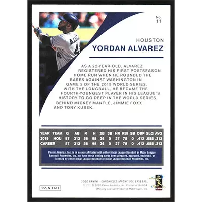 This is a 2020 Panini Chronicles Magnitude Blue Yordan Alvarez baseball card. The card is #11 and pictures show condition. This card is limited; #'d 40/50.