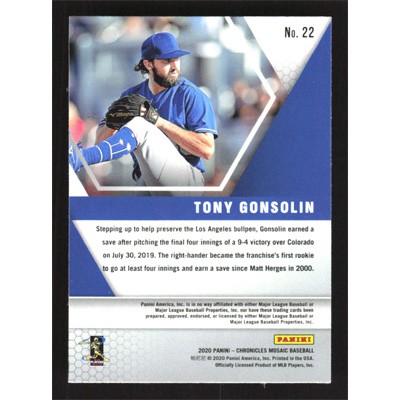 This is a 2020 Panini Chronicles Mosaic Tony Gonsolin baseball card. The card is #22 and pictures show condition. Team(s): Los Angeles Dodgers Rookie Card (RC)