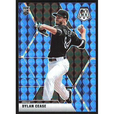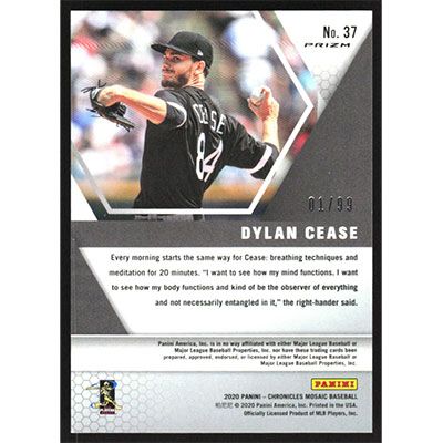 This is a 2020 Panini Chronicles Mosaic Blue Dylan Cease baseball card. The card is #37 and pictures show condition. This card is limited; #'d Jan-99. Team(s): Chicago White Sox Rookie Card (RC)