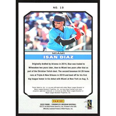This is a 2020 Panini Chronicles Obsidian Isan Diaz baseball card. The card is #19 and pictures show condition. Team(s): Miami Marlins Rookie Card (RC)