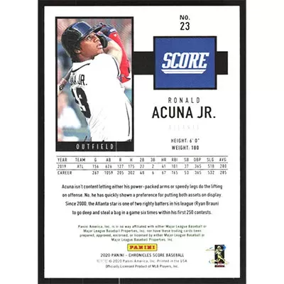 This is a 2020 Panini Chronicles Score Ronald Acuña Jr. baseball card. The card is #23 and pictures show condition.
