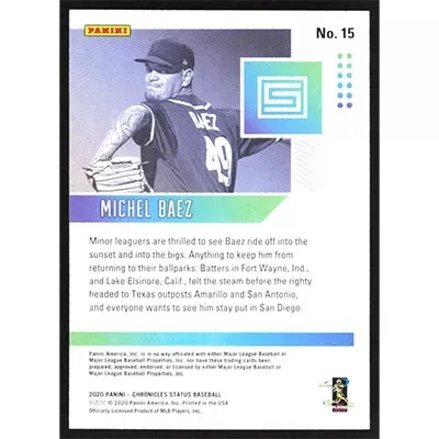 This is a 2020 Panini Chronicles Status Michel Baez baseball card. The card is #15 and pictures show condition. Team(s): San Diego Padres Rookie Card (RC)