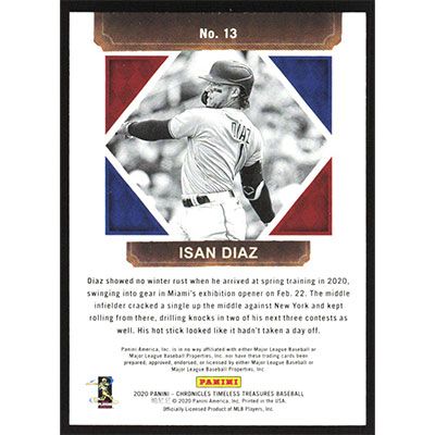 This is a 2020 Panini Chronicles Timeless Treasures Isan Diaz baseball card. The card is #13 and pictures show condition. Team(s): Miami Marlins Rookie Card (RC)
