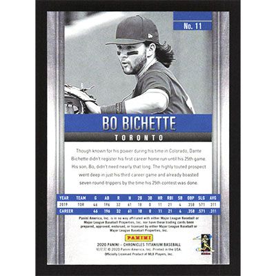 This is a 2020 Panini Chronicles Titanium Bo Bichette baseball card. The card is #11 and pictures show condition. Team(s): Toronto Blue Jays Rookie Card (RC)