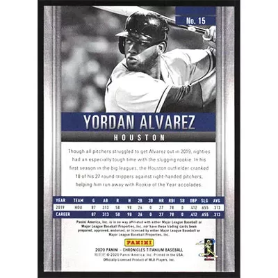 This is a 2020 Panini Chronicles Titanium Yordan Alvarez baseball card. The card is #15 and pictures show condition. Team(s): Houston Astros Rookie Card (RC)
