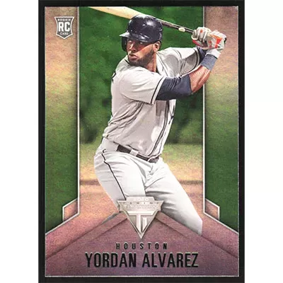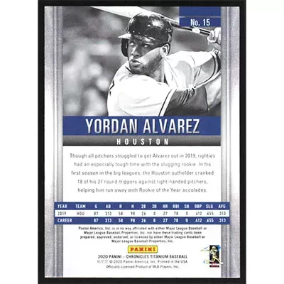This is a 2020 Panini Chronicles Titanium Green Yordan Alvarez baseball card. The card is #15 and pictures show condition. Team(s): Houston Astros Rookie Card (RC)