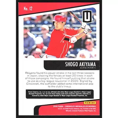 This is a 2020 Panini Chronicles Unparalleled Shogo Akiyama baseball card. The card is #12 and pictures show condition. Team(s): Cincinnati Reds Rookie Card (RC)
