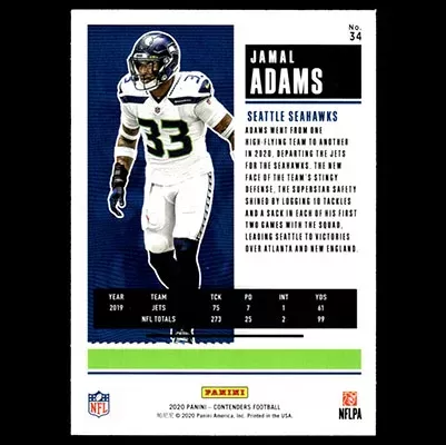 This is a 2020 Panini Contenders Jamal Adams football card. The card is #34 and is in NM-MT condition.