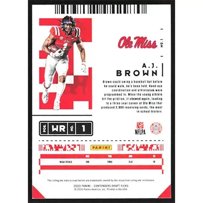 This is a 2020 Panini Contenders Draft Picks A.J. Brown football card. The card is #1 and pictures show condition.