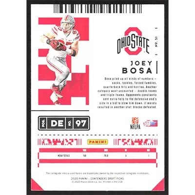 This is a 2020 Panini Contenders Draft Picks Joey Bosa football card. The card is #51 and pictures show condition.