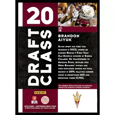 This is a 2020 Panini Contenders Draft Picks Draft Class Brandon Aiyuk football card. The card is #18 and pictures show condition. Team: Arizona State Sun Devils Rookie Card