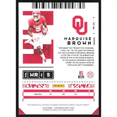 This is a 2020 Panini Contenders Draft Picks Draft Ticket Green Foil Marquise Brown football card. The card is #66 and pictures show condition. Team(s): Oklahoma Sooners