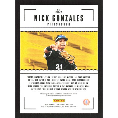 This is a 2020 Panini Contenders First Rounders Nick Gonzales baseball card. The card is #FR-7 and pictures show condition.