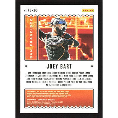 This is a 2020 Panini Contenders Future Stars Joey Bart baseball card. The card is #FS-20 and pictures show condition.