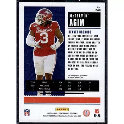 This is a 2020 Panini Contenders Rookie Ticket McTelvin Agim football card. This card has been signed, in blue, by McTelvin Agim, and is guaranteed authentic by Ballcardz.com. The card is #248 and pictures show condition. Team: Denver Broncos Rookie Card