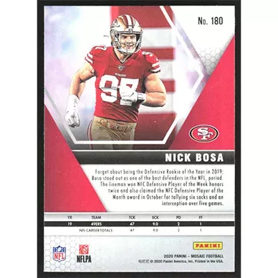 This is a 2020 Panini Mosaic Nick Bosa football card. The card is #180 and pictures show condition.
