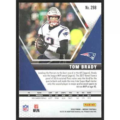This is a 2020 Panini Mosaic Tom Brady MVPs football card. The card is #298 and pictures show condition.