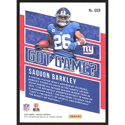 This is a 2020 Panini Mosaic Got Game? Saquon Barkley football card. The card is #GG9 and pictures show condition.