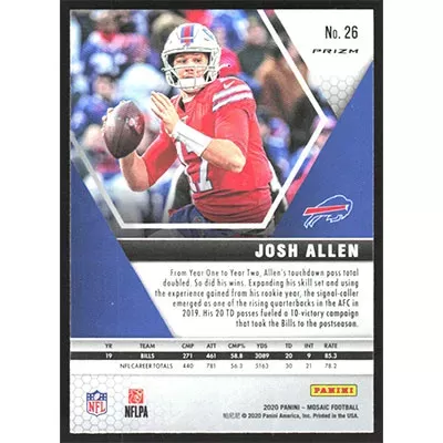 This is a 2020 Panini Mosaic Green Josh Allen football card. The card is #26 and pictures show condition.