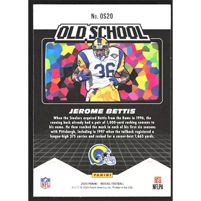 This is a 2020 Panini Mosaic Old School Jerome Bettis football card. The card is #OS20 and pictures show condition.