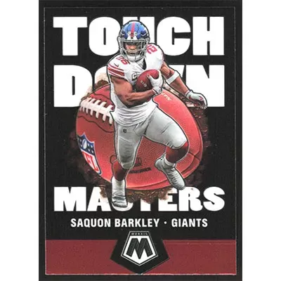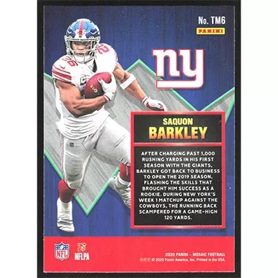 This is a 2020 Panini Mosaic Touchdown Masters Saquon Barkley football card. The card is #TM6 and pictures show condition.