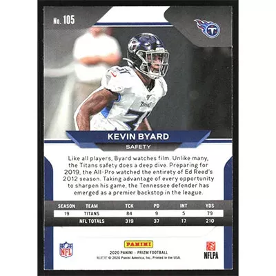 This is a 2020 Panini Prizm Kevin Byard football card. The card is #105 and pictures show condition.