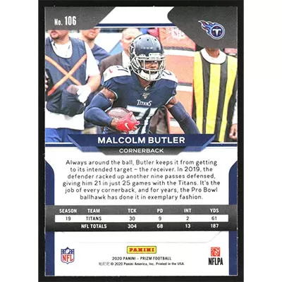 This is a 2020 Panini Prizm Malcolm Butler football card. The card is #106 and pictures show condition.