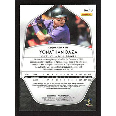 This is a 2020 Panini Prizm Yonathan Daza baseball card. The card is #13 and pictures show condition.