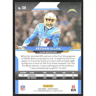 This is a 2020 Panini Prizm Keenan Allen football card. The card is #139 and pictures show condition.