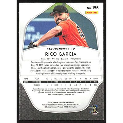 This is a 2020 Panini Prizm Rico Garcia baseball card. The card is #156 and pictures show condition.