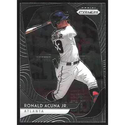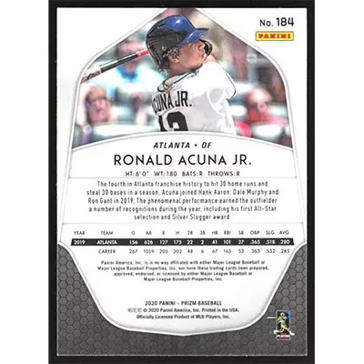 This is a 2020 Panini Prizm Ronald Acuña Jr. baseball card. The card is #184 and pictures show condition.