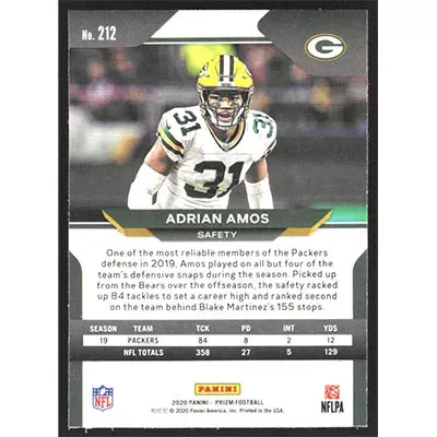 This is a 2020 Panini Prizm Adrian Amos football card. The card is #212 and pictures show condition.