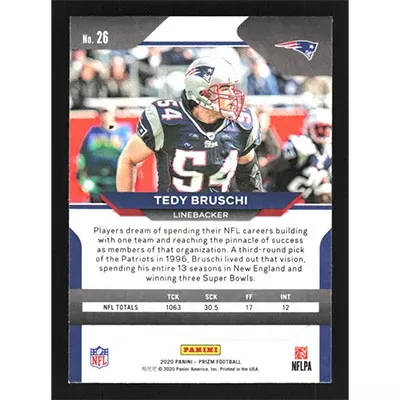 This is a 2020 Panini Prizm Tedy Bruschi football card. The card is #26 and pictures show condition.