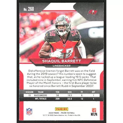This is a 2020 Panini Prizm Shaquil Barrett football card. The card is #260 and pictures show condition.