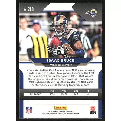 This is a 2020 Panini Prizm Isaac Bruce football card. The card is #280 and pictures show condition.