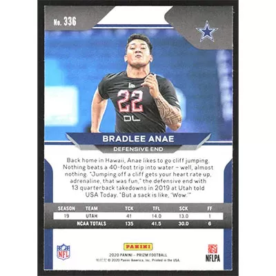 This is a 2020 Panini Prizm Bradlee Anae football card. The card is #336 and pictures show condition.