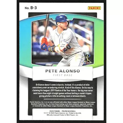 This is a 2020 Panini Prizm Brilliance Pete Alonso baseball card. The card is #B-3 and pictures show condition.