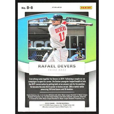 This is a 2020 Panini Prizm Brilliance Purple Rafael Devers baseball card. The card is #B-8 and pictures show condition.