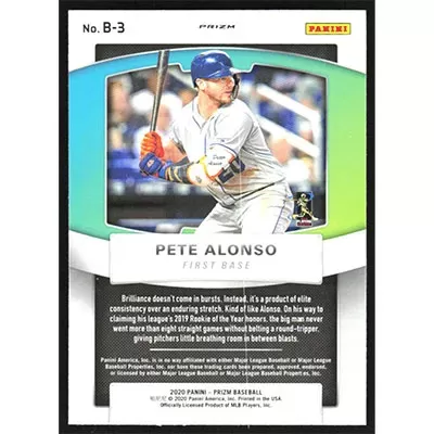 This is a 2020 Panini Prizm Brilliance Red White and Blue Pete Alonso baseball card. The card is #B-3 and pictures show condition.