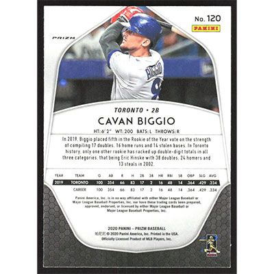This is a 2020 Panini Prizm Carolina Blue Cavan Biggio baseball card. The card is #120 and pictures show condition.