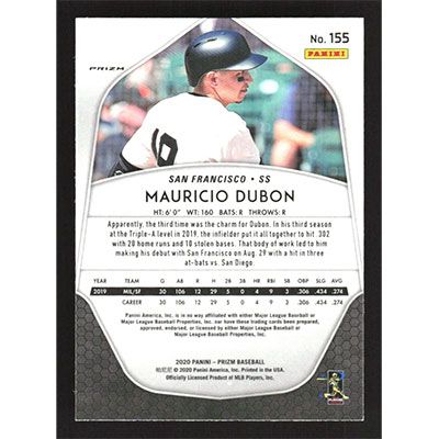 This is a 2020 Panini Prizm Carolina Blue Mauricio Dubon baseball card. The card is #155 and pictures show condition. Team(s): San Francisco Giants Rookie Card (RC)