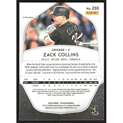 This is a 2020 Panini Prizm Carolina Blue Zack Collins baseball card. The card is #233 and pictures show condition. Team(s): Chicago White Sox Rookie Card (RC)