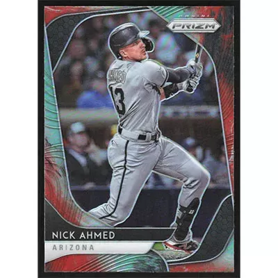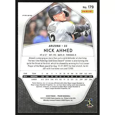 This is a 2020 Panini Prizm Cosmic Haze Nick Ahmed baseball card. The card is #179 and pictures show condition.