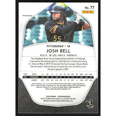 This is a 2020 Panini Prizm Cosmic Haze Josh Bell baseball card. The card is #77 and pictures show condition.