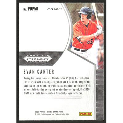 This is a 2020 Panini Prizm Draft Picks Green and Yellow Hyper Evan Carter baseball card. The card is #PDP50 and pictures show condition. Team(s): Texas Rangers