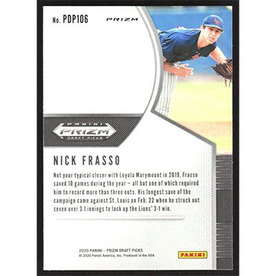 This is a 2020 Panini Prizm Draft Picks Green Pulsar Nick Frasso baseball card. The card is #PDP106 and pictures show condition. Team(s): Loyala Marymount Lions