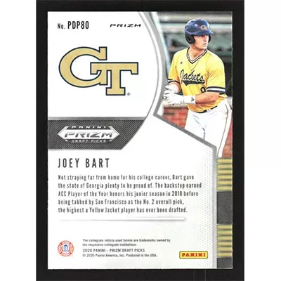 This is a 2020 Panini Prizm Draft Picks Green Pulsar Joey Bart baseball card. The card is #PDP80 and pictures show condition. Team(s): Georgia Tech Yellow Jackets