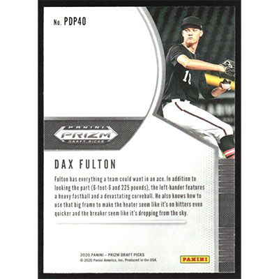 This is a 2020 Panini Prizm Draft Picks Dax Fulton baseball card. The card is #PDP40 and pictures show condition.