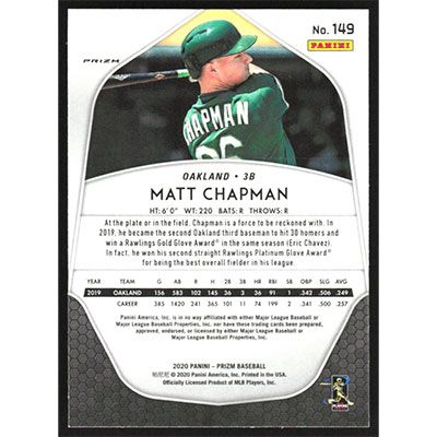 This is a 2020 Panini Prizm Green Matt Chapman baseball card. The card is #149 and pictures show condition.