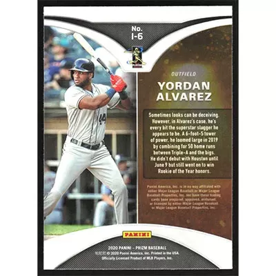 This is a 2020 Panini Prizm Illumination Yordan Alvarez baseball card. The card is #I-6 and pictures show condition. Team(s): Houston Astros Rookie Card (RC)